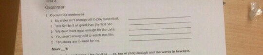 1. isn't tall enough (поменять местами) 2. isn't as good as 3. enough eggs 4. aren't old enough 5. too small