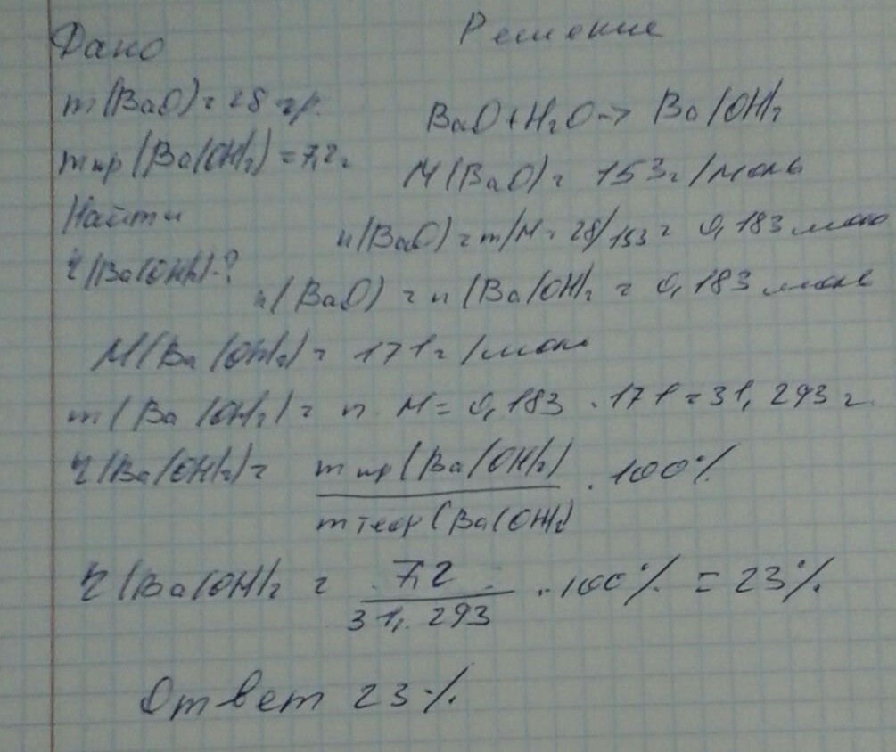 При взаимодействии оксида бария массой 28г с водой было получено 7,2г гидроксида бария.Сколько это составляет в % от теоретически возможного.(9 класс)
