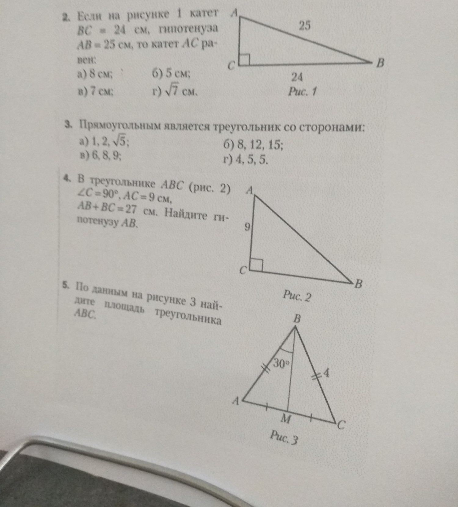 3). Прямоугольным является ТОЛЬКО треугольник со сторонами 1,2,√5, так как по Пифагору 1²+2²=(√5)² => 5=5.