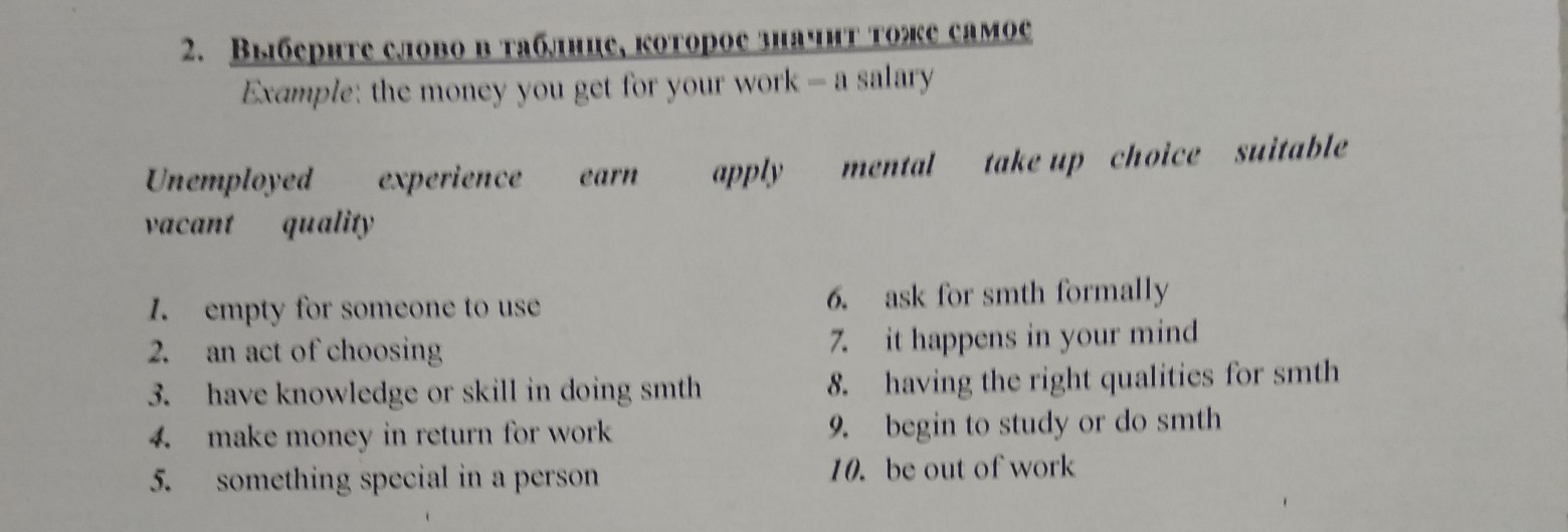 1. Vacant 2. Choice 3. Experience 4. Earn 5. Quality 6. Apply 7. Mental 8. Suitable 9. Take up 10. Unemployed