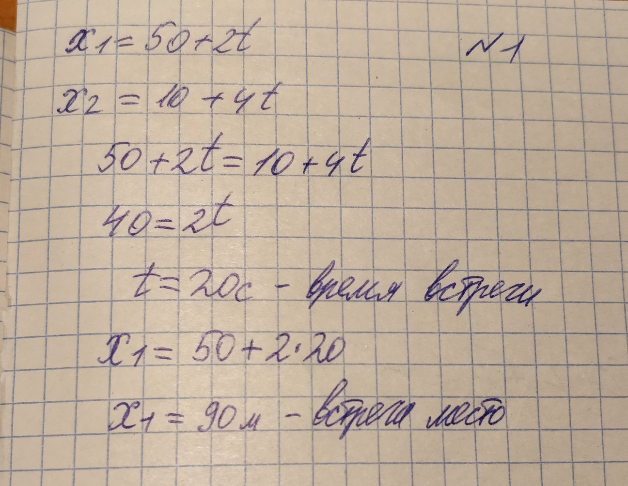 1. Два тела движутся так, что их движения описываются уравнениями: х1=50+2t и х2 =10+4t .Определите время и место встречи тел.