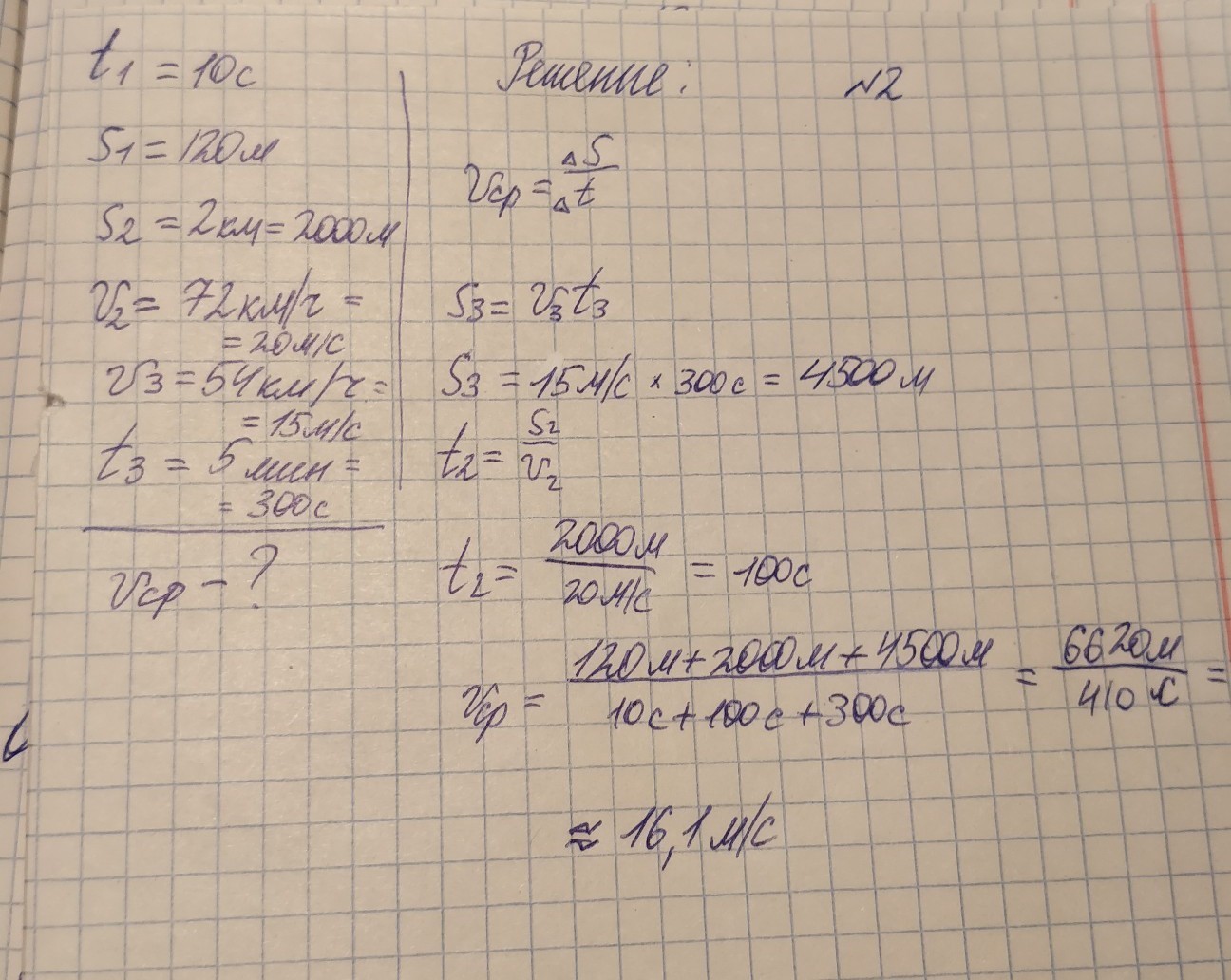 2. Автомобиль за 10с проехал расстояние 120 метров, затем следующий участок длиной 2 км он двигался со скоростью 72км/ч. Последний участок двигаясь со скоростью 54 км/ч он проехал за 5 минут. Определите среднюю скорость автомобиля на всем пути.