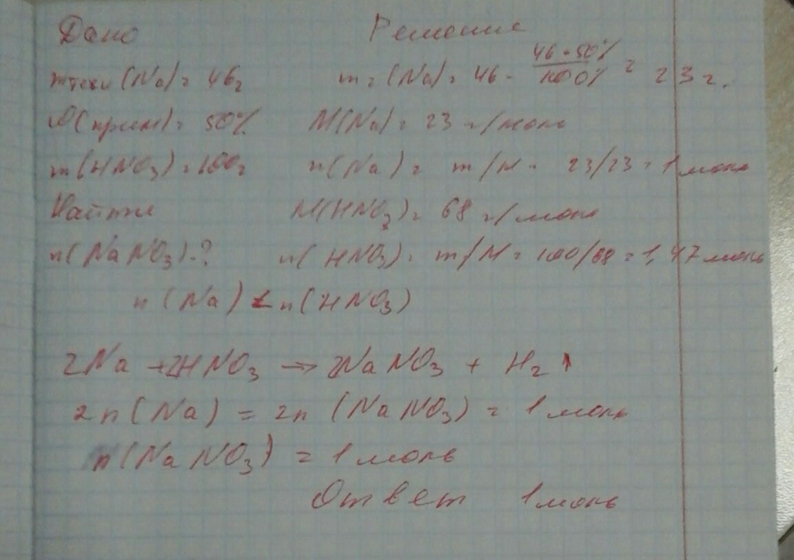 какое количество вещества нитрата натрия образуется при взаимодействии 46г. натрия, содержащего 50% примесей и 100г. азотной кислоты