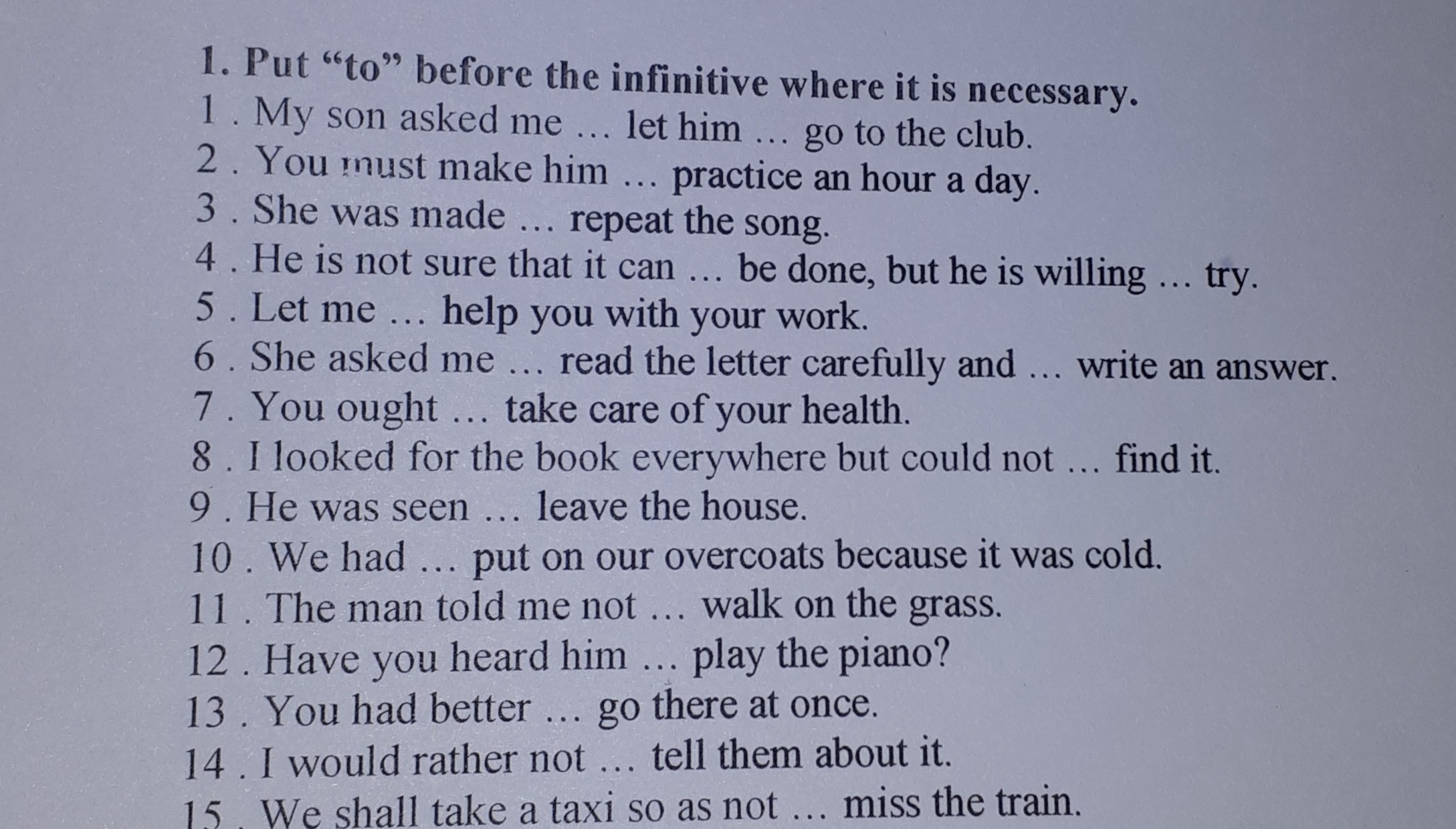 1.to let/2.to practise/3.to repeat/4.be done, willing to try/5.let me help/6.to read. write/7.ought to/8.could not find/9.to leave/10.had put/11.not to walk/12.to play/13.to go/14.not tell/15.not to miss