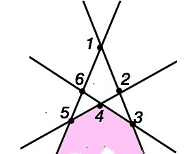 Но одна часть ( на рисунке она розового цвета) посчитана дважды для пересечений при точках 3 и 5. Следовательно, плоскость четырьмя прямыми может быть разделена на 12-1=11 частей.