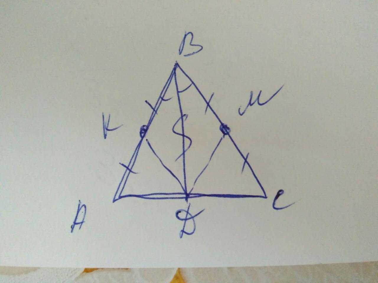 Дано: ΔАВС - равнобедренный, АК = КВ = ВМ = МС (т. К и М - середины боковых сорон АВ и СВ соответственно), ВD - медиана.