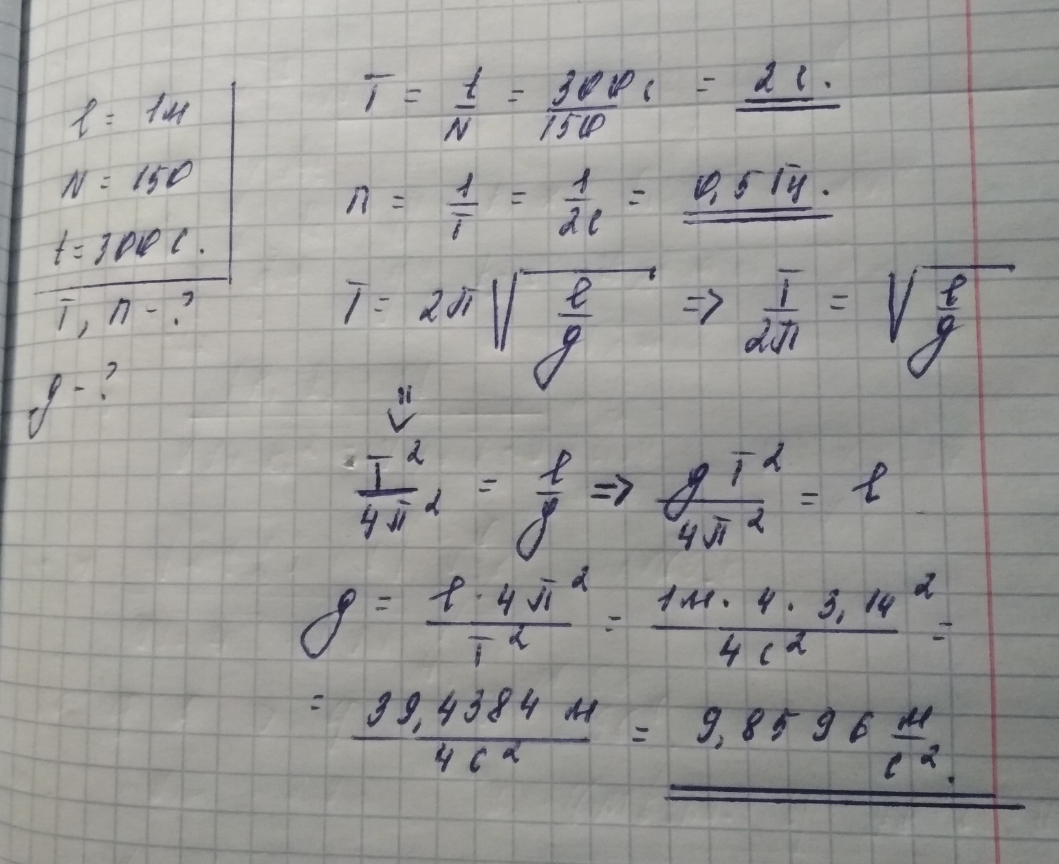 Маятник, длинна нити которого 1м, совершает 150 колебаний за 300с. Чему равны период и частота колебаний маятника? Определите ускорение свободного падения по этим данным