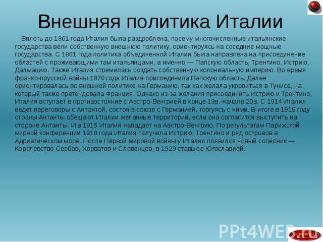Внешняя и внутренняя политика Италии в конце 19 века !!! Помогите !!! (Желательно развернутый ответ )