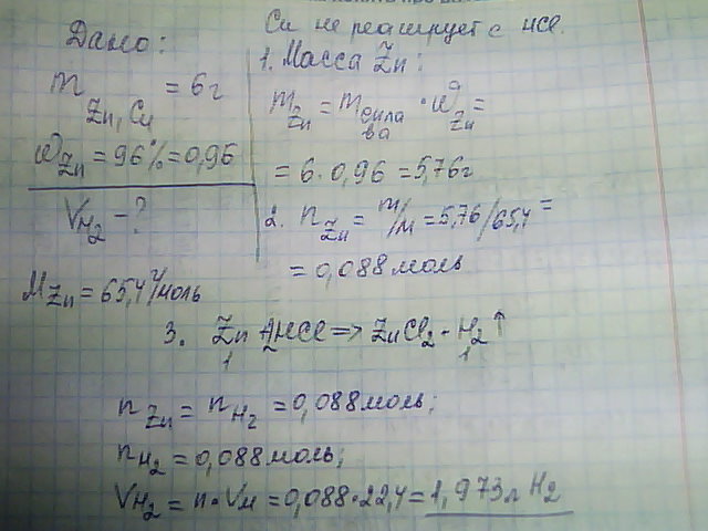 Вычислите обьем водорода, если в раствор соляной кислоты поместили сплав, содержащий 96% цинка и меди, масса сплава равна 6 г. Желательно фото