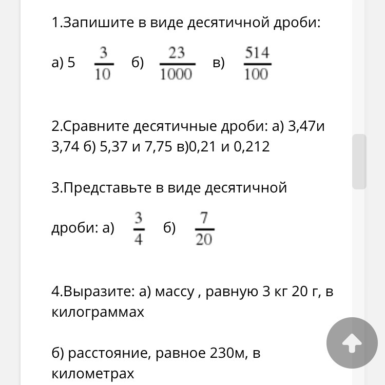 Ответ: 1. а) 5,3 б) 0,023 ; в) 5,14 2.а) 3.47<3.74 ; б) 5,37 < 7,75 ; в) 0,21 <0,212 ; 3. а) 3/4 = 0,75 ; б) 7/20 = 0,35 ; 4. а) 3 кг 20 г = 3,02 кг ; б) 230 м = 0,23 км