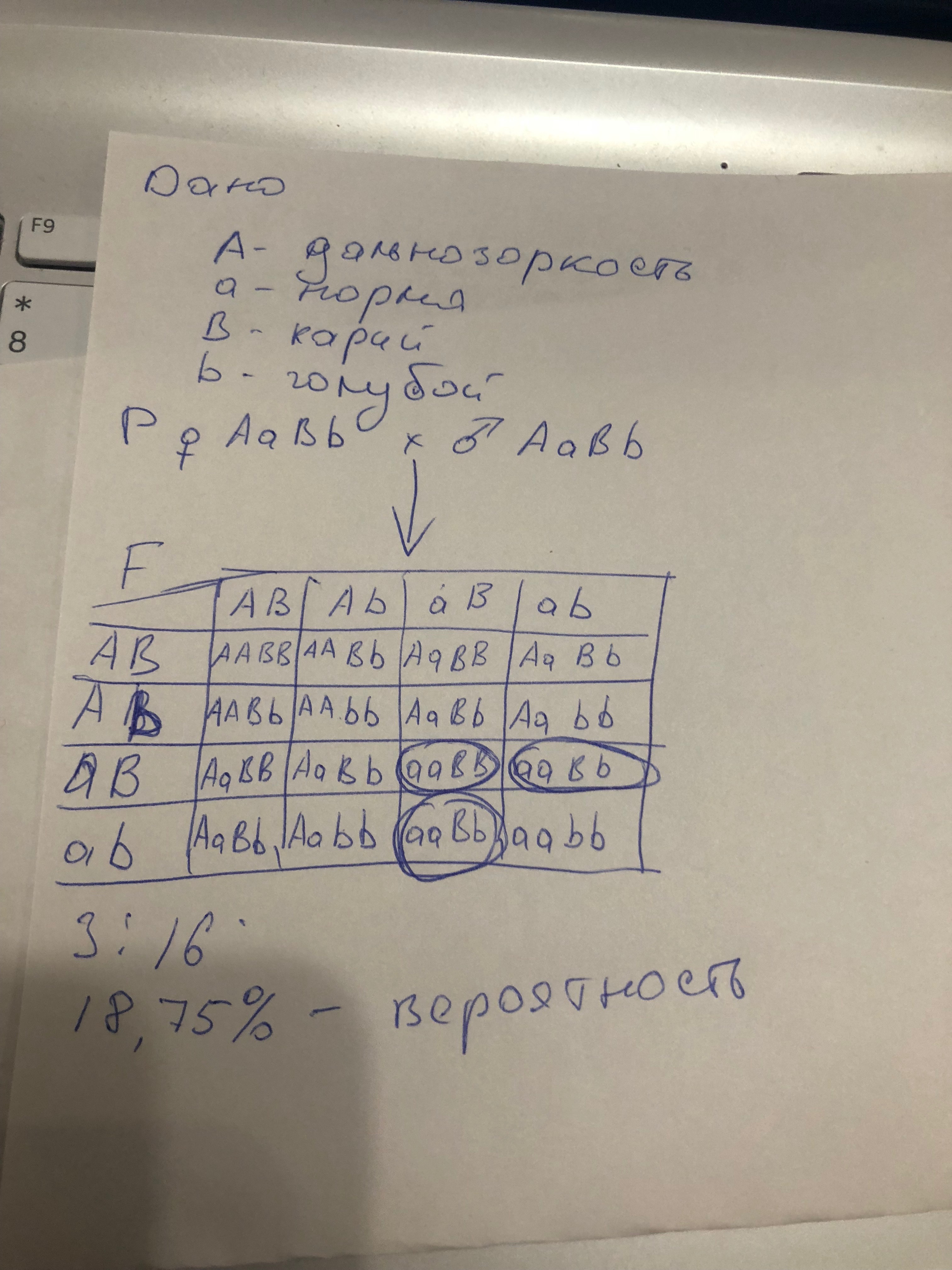У человека некоторые формы дальнозоркости доминируют над нормальным зрением, карий цвет глаз — над голубым. Определи вероятность появления в потомстве кареглазых детей, имеющих нормальное зрение, если оба родителя гетерозиготны по обоим признакам