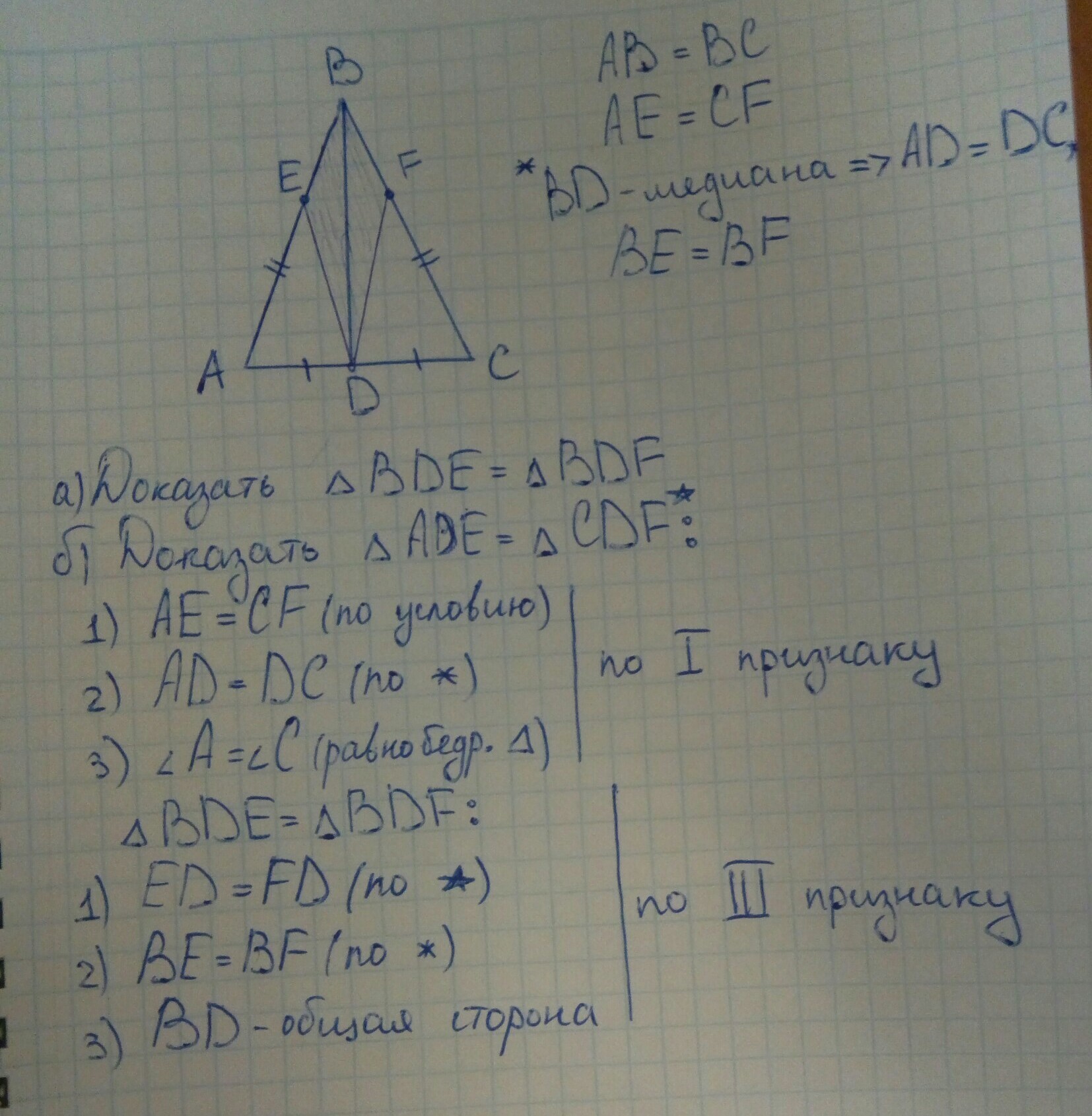 В равнобедренном треугольнике АВС с основанием АС проведена медиана BD. На сторонах АВ и СВ отмечены соответственно точки Е и F так, что АЕ=СF. Докажите, что: