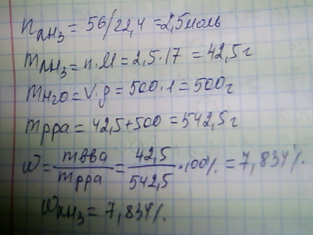 56 литров аммиака раствортли в 500 мл воды, определите массовую долю аммиака в полученном растворе.