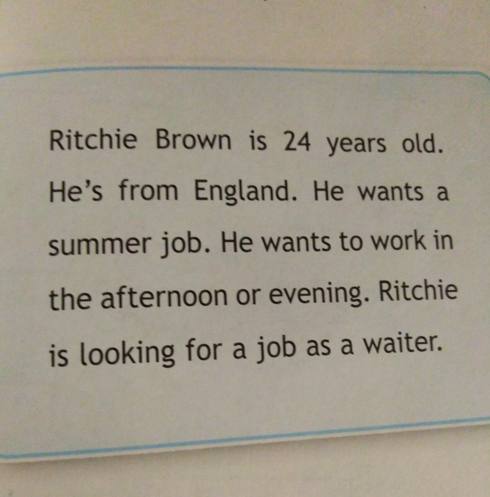 ритчу Брауну 24 года.Он из Англии. Он работает на летней работе. Он работает днём и ночью. Ритч смотрит за работой на воде