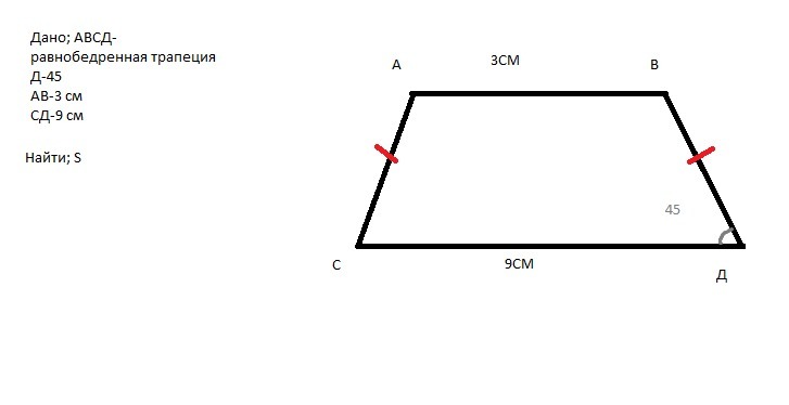 Проводим перпендикуляр с точки B к нижней основе ДС - точке М (пусть будет). Получаем треугольник ВМД, в котором: