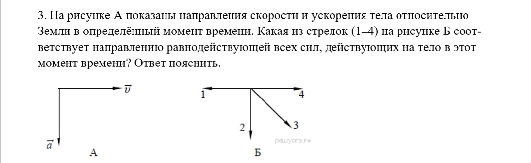 На рис. показаны направления скорости и ускорения тела в данный момент времени. Какая из стрелок (1–4) на рис. Б соответствует направлению результирующей всех сил, действующих на тело? С ПОЛНЫМ РЕШЕНИЕМ ПОЖАЛУЙСТА ДАНО РЕШЕНИЕ И ОТВЕТ
