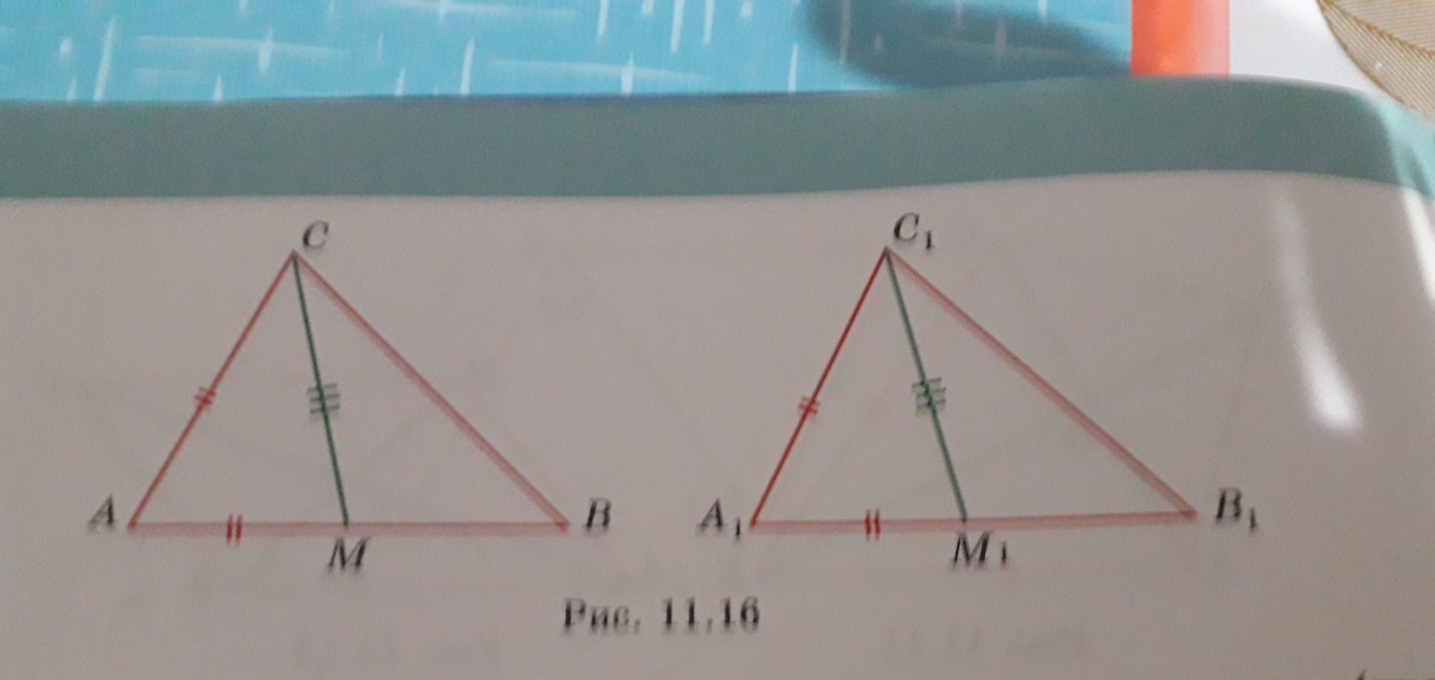 Докажите что треугольники АВС и А1В1С1 равны, если у них равны стороны АВ и А1В1, АС и А1С1, медианы СМ и С1М1 (рис. 11.16)