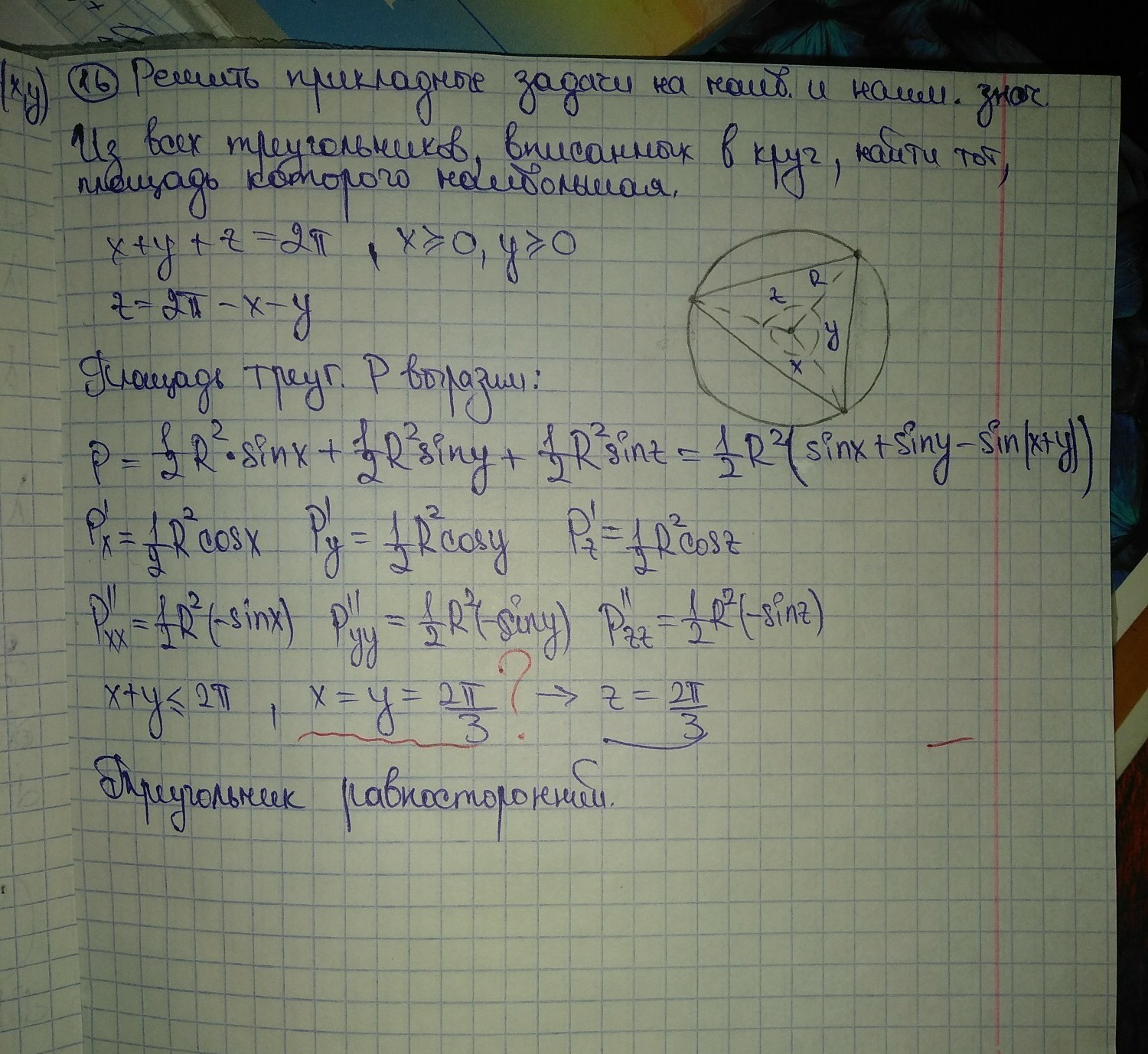 Из всех треугольников, вписанных в круг, найти тот, площадь которого наибольшая. Помогите дорешать, пожалуйста