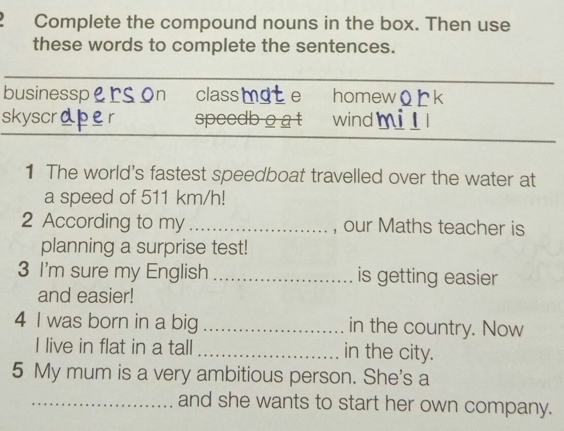 2 classmates, 3 homework, 4 windmill, skyscraper, 5 bissunessperson