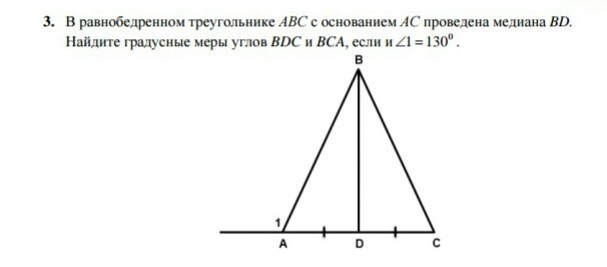 Треугольник ABC равнобедренный. К нему проведена медиана BD. Поскольку треугольник равнобедренный, медиана BD будет являться ещё и высотой. Из этого следует что угол BDA и BCD равны 90°. К основанию AC проведена линия. выбираем любую точку например К. рассматриваем угол CAK. Он развернутый, а все развернутые углы равны 180° . Нам известна величина угла CAB. Она равна 130°. угол BAD =