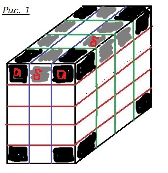 1. разместить черные кубики в вершинах параллелепипеда. Там их черные грани будут располагаться в трех гранях построенного параллелепипеда, т.е. видны будут три грани из шести . Т.е. в каждой вершине параллелепипеда, а их 8, будет черный кубик, с видимой площадью черной области 3 ед. пл. Это кубики а на рис. 1.