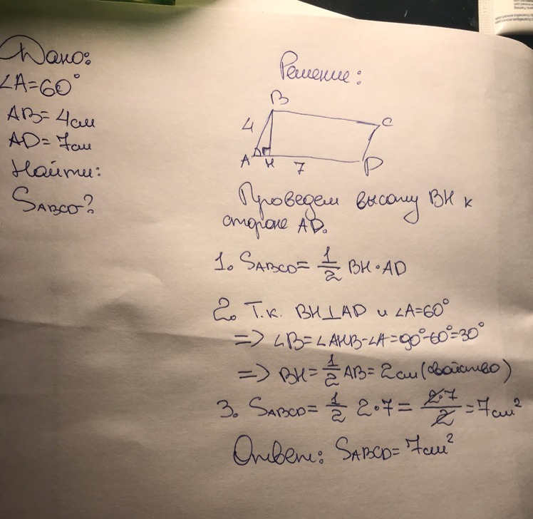 Стороны параллелограмма равны 4см и 7см, а угол между ними равен