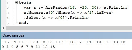for i:=1 to 16 do begin if (a[i] mod 2=0) and (a[i]<>0) then write(i,' '); if a[i]<0 then k:=k+1 end;