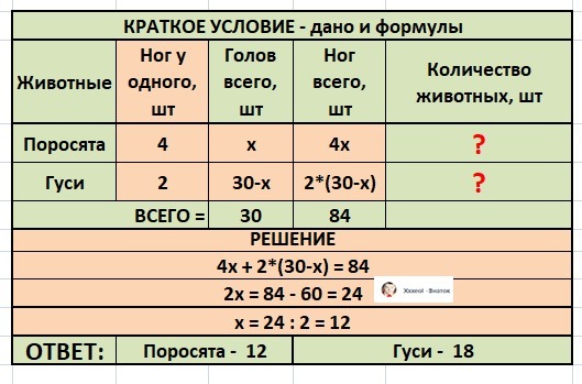 на лугу паслись гуси и поросята Незнайка сосчитал количество ног их оказалось 84 Пуговка сосчитала количество голов 30 вечером недосчитались трех поросят сколько поросят добрались до загона