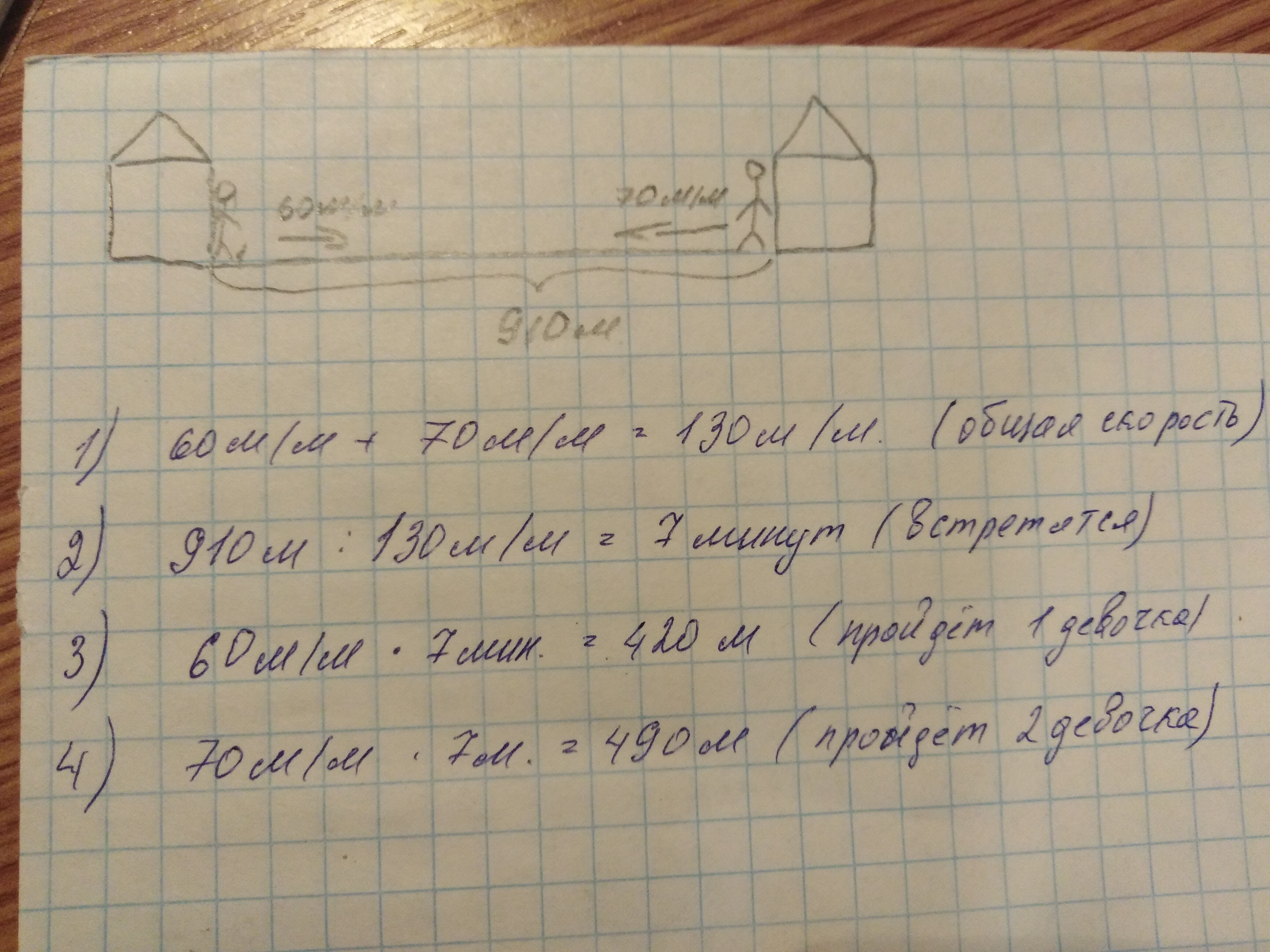 Одновременно из двух домов вышли две девочки одна шла со скоростью 60 м в минуту другая Шла со скоростью 70 м в минуту расстояние между домами 910 М Вопрос сколько до встречи прошла каждая девочка?