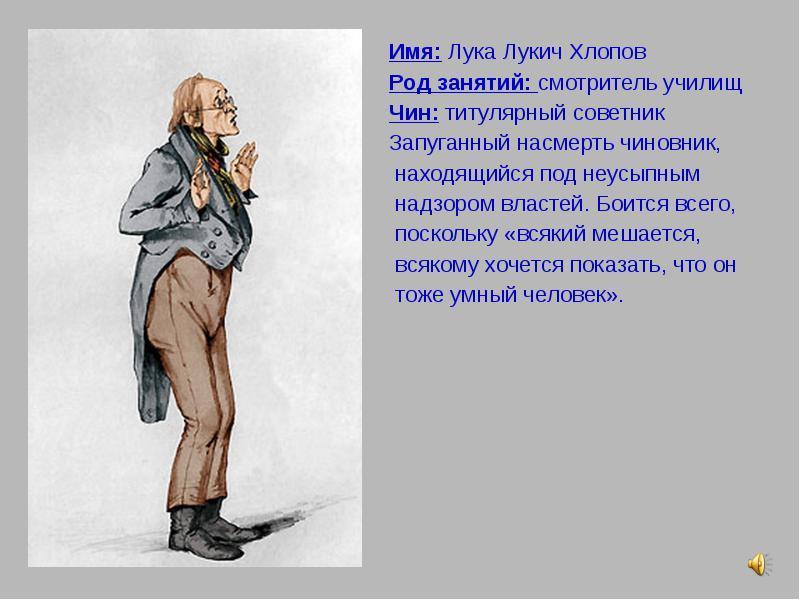 Лука Лукич Хлопов - смотритель училищ, второстепенный персонаж комедии Н. В. Гоголя "Ревизор". Как один из представителей чиновничества, дополняет своей персоной вереницу госслужащих, от которых зависит благополучие уездного города. И если Земляника, попечитель богоугодных заведений, проныра и плут, а Городничий - царь и бог, то Хлопов - тишайший трус, кторый живёт по принципу "как бы чего не случилось" и "авось, пронесёт".