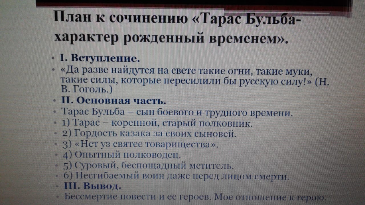 Тарас Бульба старый казак, основная черта его характера- беззаветный патриотизм. Тарас Бульба гордится своими сыновьями и видит в них «Патриотов», которые преданы своей родине. Но вскоре Андрий (младший сын Траса Бульбы) предаёт свой народ и свою родину, вскоре Бульба убивает его, потому что ему было очень стыдно за такой подлый поступок сына. Ведь для казака нет ничего страшнее как предать своих родных, родину, веру. Казаки готовы были пожертвовать своей жизнью ради своей родины со словами (из текста): «Не жаль расстаться со светом. Пусть же славится до конца века Русская земля!». В конце погибает и Остап (старший сын Тараса Бульбы) и много других преданных своей родине казаков, и Тарас Бульба. Последние моменты жизни Тараса Бульбы — это беззаветная любовь к Товарищам и родине. Он не думает о себе, и не о костре, который разводят его враги чтобы сжечь его заживо. Бульба помогает спастись своим товарищам, родственникам, даёт им советы, чтобы они смогли дольше прожить и защищать родину от поляков.