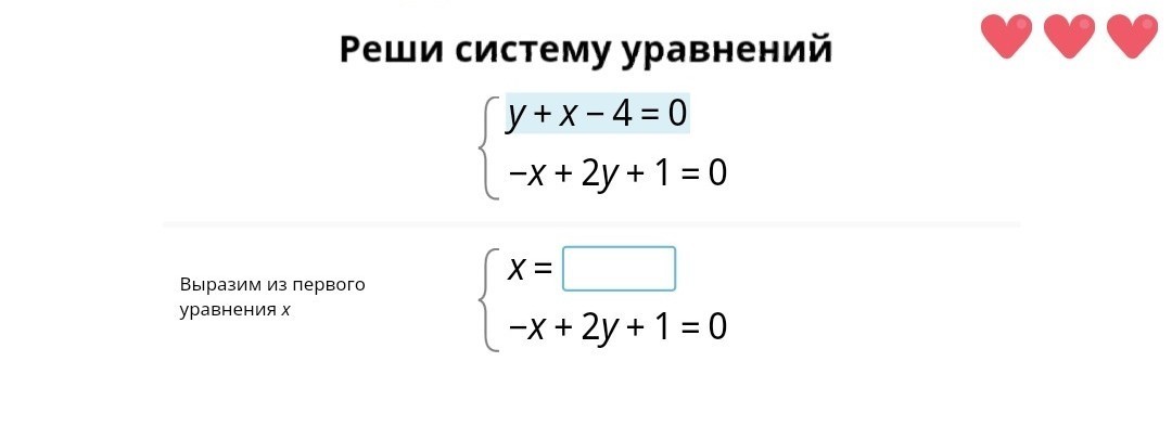 left { {{y + x - 4 = 0} atop {-x+2y+1=0}} right. \left { {{x =4-y} atop {-(4-y)+2y+1=0}} right. \left { {{x=4-y} atop {-4+y+2y+1=0}} right. \\left { {{x=4-y} atop {-3+3y=0}} right. \left { {{x=4-y} atop {3y=3}} right. \left { {{x=4-y} atop {y=1}} right. \left { {{x=3} atop {y=1}} right.