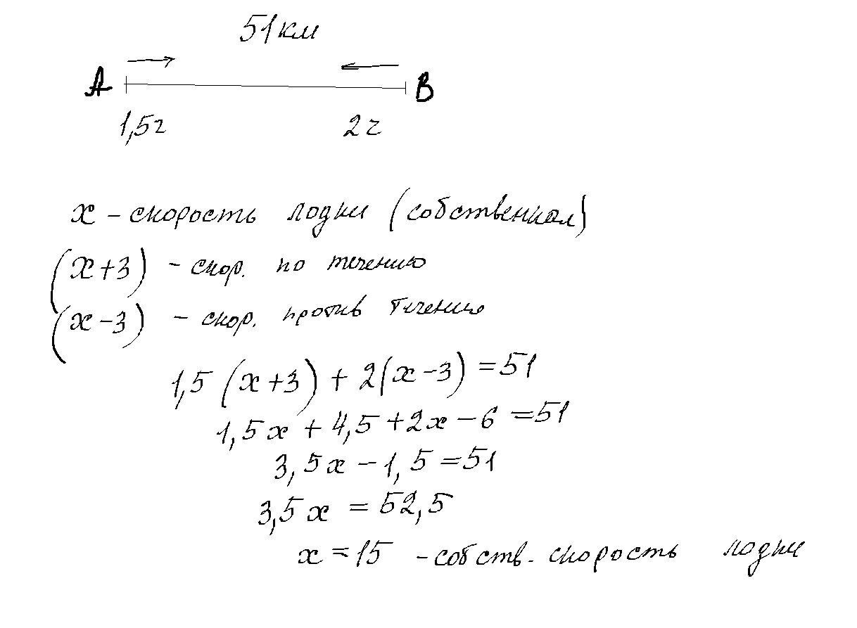 Из двух пунктов реки расстояние между которыми 51 км навстречу друг другу движутся две моторные лодки собственные скорости которых равны скорость течения реки 3 км ч лодка идущая по течению до Истры до встречи прошла, 1,5 а лодка идущая против течения - 2 часа Найдите собственную скорость лодок