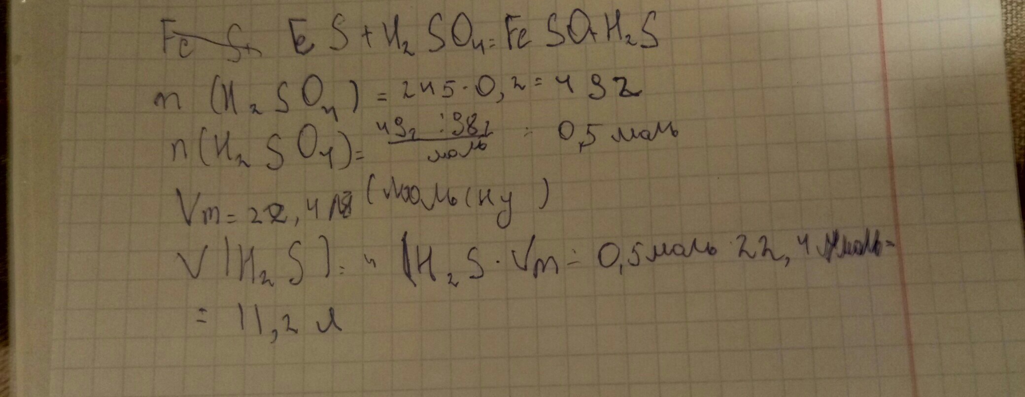 Вычислите объём газа (н. у.), который выделится при действии избытка сульфида железа(II) на 245 г 20%-ного раствора серной кислоты.