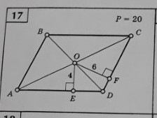 Р=20 Р=2(а+в)=20 а+в=10 а=10-в, пусть в=АД. АВ=а=10-в ЕО это половина высоты АВСД значит H1=8/ H2=6*2=12 выразим площадь АВСД через две высоты S=8в и S=12(10-в), приравняем , 8в=120-12в,