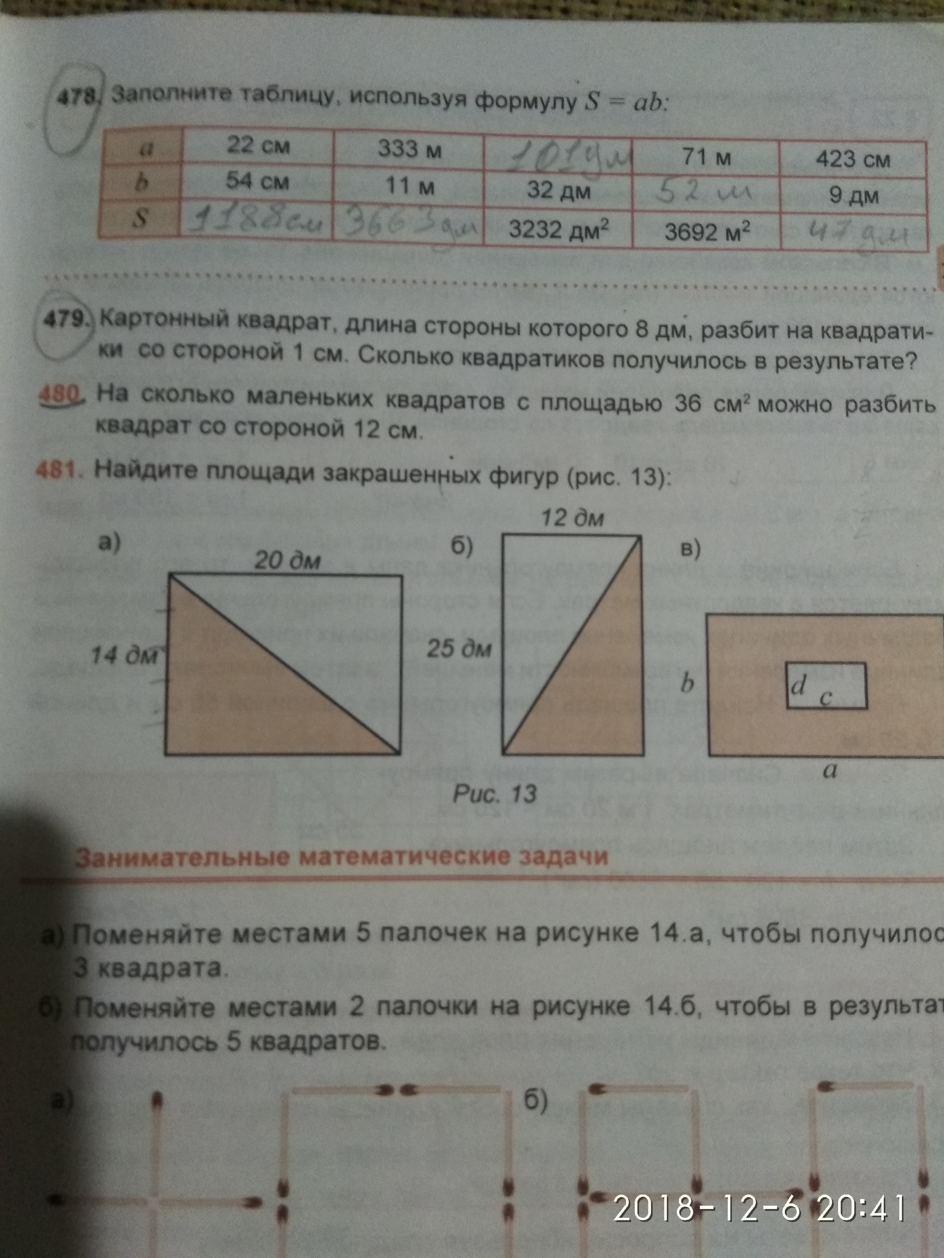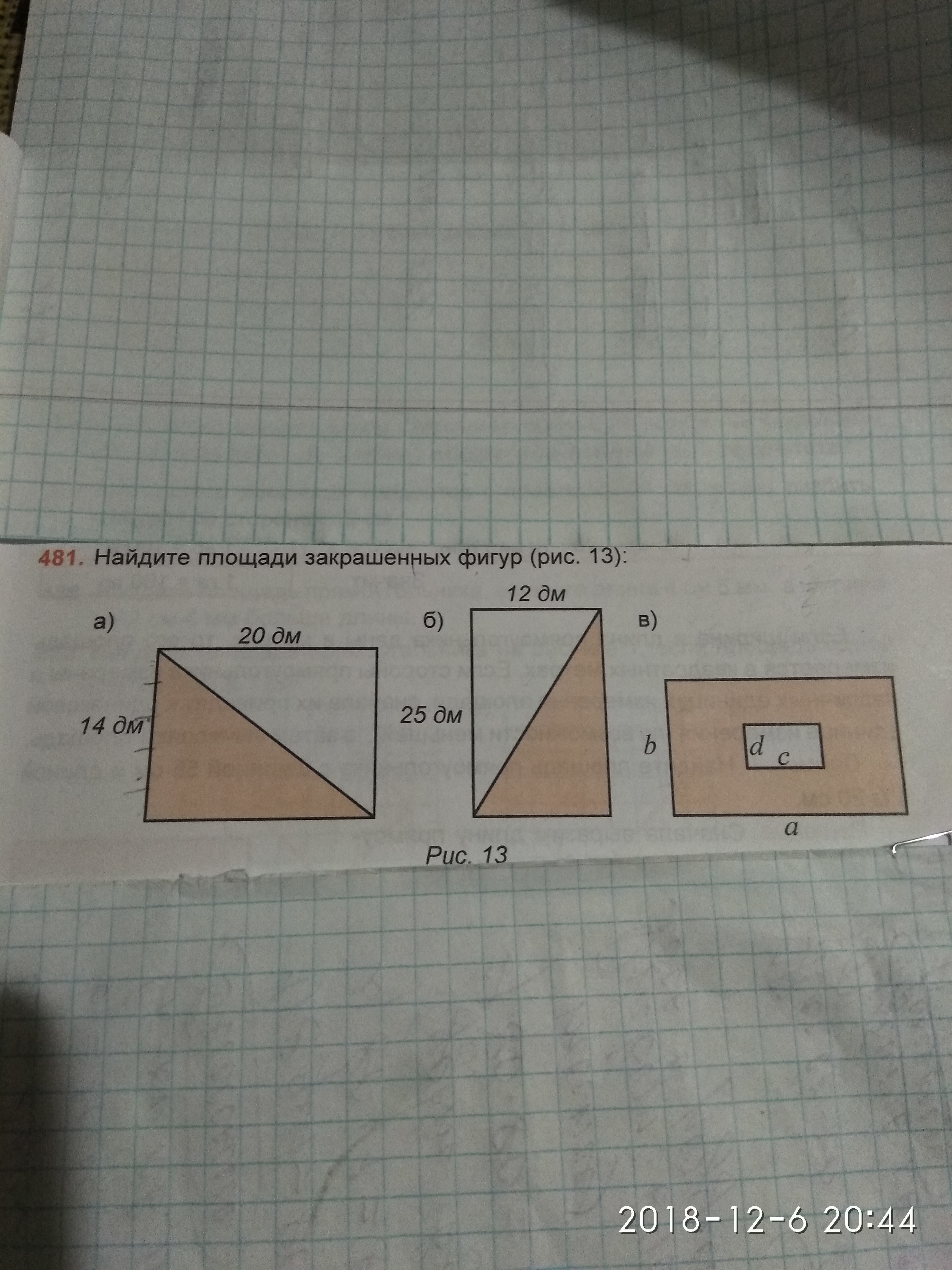 Помогите пожалуйста с математикой за 5 класс. Номер 481. Найдите площади закарашенных фигур.