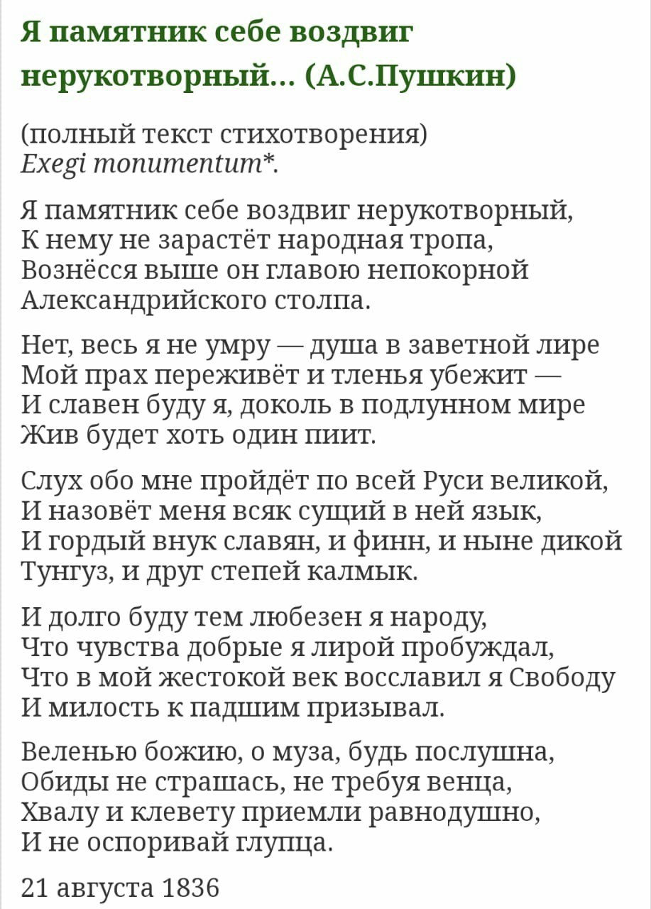 Значимость темы и высокий пафос стихотворения определили особую торжественность его общего звучания. Медленный, величественный ритм создается не только за счет одического размера (ямб с пиррихием), а также за счет анафор, таких как: "И славен буду я...", " И назовет меня...", "И гордый внук славян...". Также величественность создается благодаря инверсии («Вознесся выше он главою непокорной Александрийского столпа.") и синтаксического параллелизма и рядов однородных членов («И гордый внук славян, и финн, и ныне дикой тунгус...»).