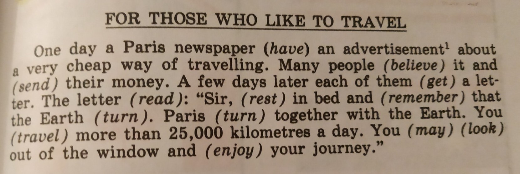 One day a Paris newspaper had an advertisement about a very cheap way of travelling. Many people believed it and sent their money. A few days later each of them got a letter. The letter read. "Sir, rest in bed and remember that the Earth turns. Paris turns together with the Earth. You travel more than 25,000 kilometres a day. You may look out of the window and enjoy your journey."