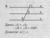 2. если при пересечении двух прямых третьей сумма односторонних углов равна 180°, то эти прямые параллельны; ∠2+∠3=180° ⇒ в║с;