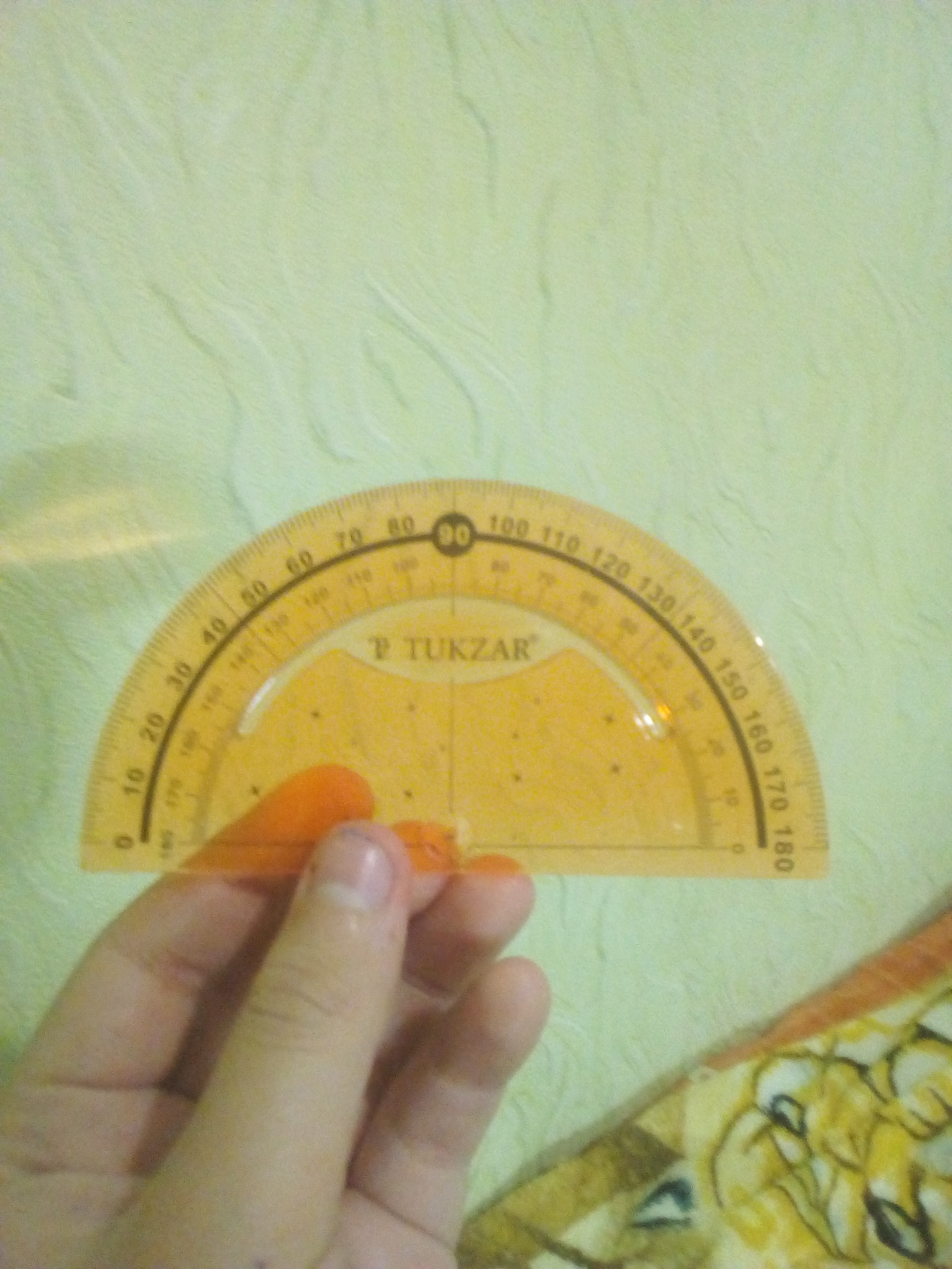 Ставиш транспортир так щоб лінія 0 була на куті і дивишся на цифри зверху куди іде промінь