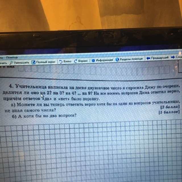 а) Покажем, что написанное число чётно. Если бы оно было нечётным, то на вопросы о делимости на 2, 4, 6 и 8 Дима ответил «нет», а тогда, стало быть, на вопросы о делимости на 3, 5, 7 и 9 он ответил «да». Но если число делится на 5, 7 и 9, то оно делится на 5 7 9 = 315 и не может быть двузначным. Значит, на первый вопрос учительницы можно с уверенностью ответить утвердительно