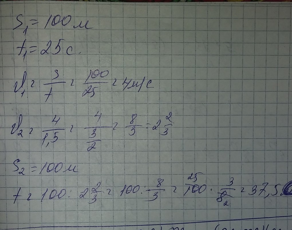 На соревнованиях по плаванию лучший результат оказался у спортсмена, проплывшего 100 м за 25 сек. За какое время проплывет эту дистанцию начинающий спортсмен, если его средняя скорость в 1,5 раза меньше скорости победителя?