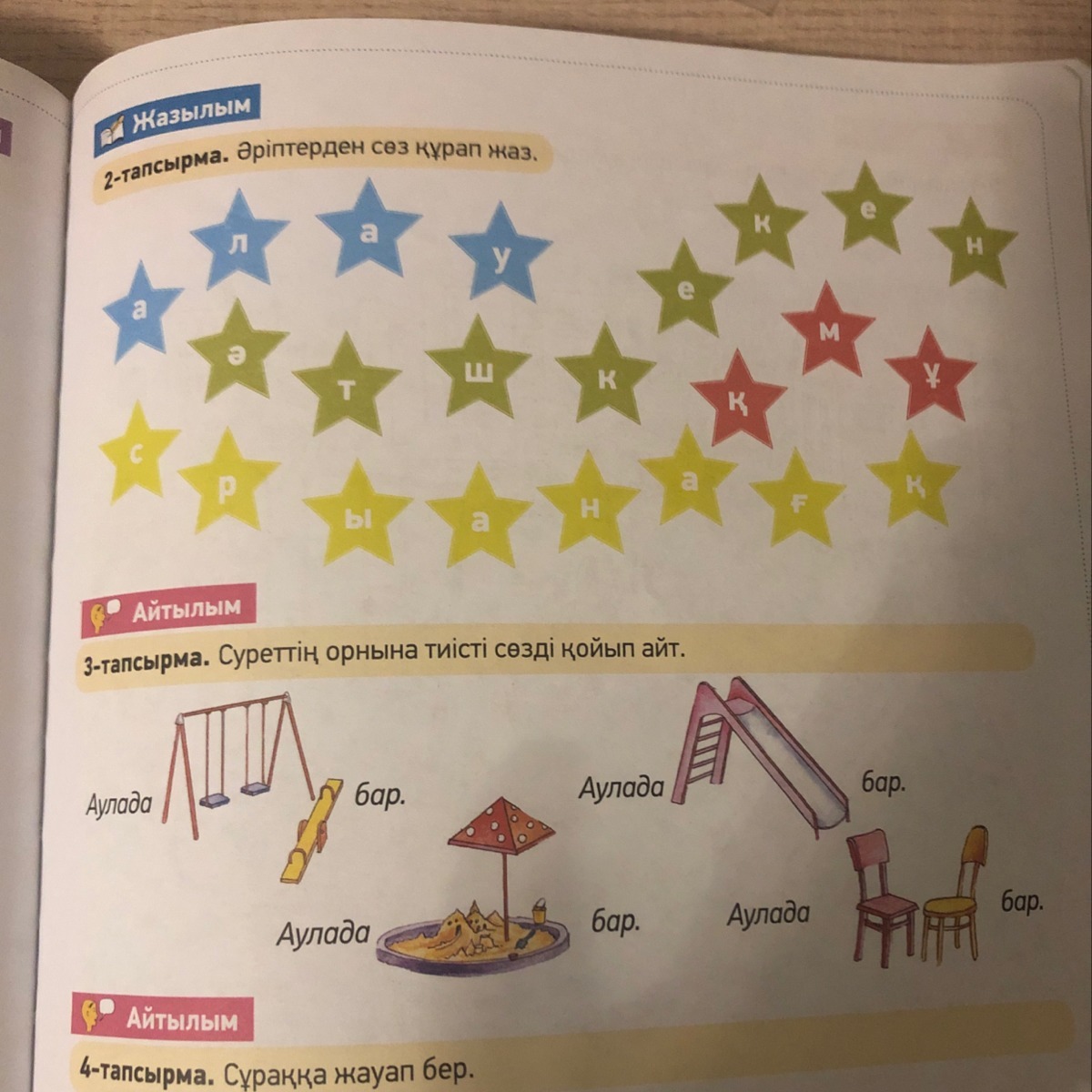 2тапсырма:Алау, Алуа, сары, ана, аға, аң, әтеш, құм, Сара, кек, ене,әке, алу,