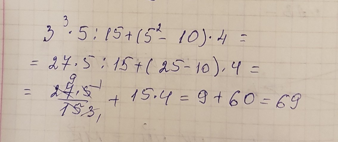 Помогите решить. 3 в кубе*5:15+(5в квадрате-10)*4