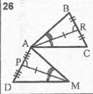 Равные треугольники это BAR =CAR потому что AR совместная сторона и AMP=DMR