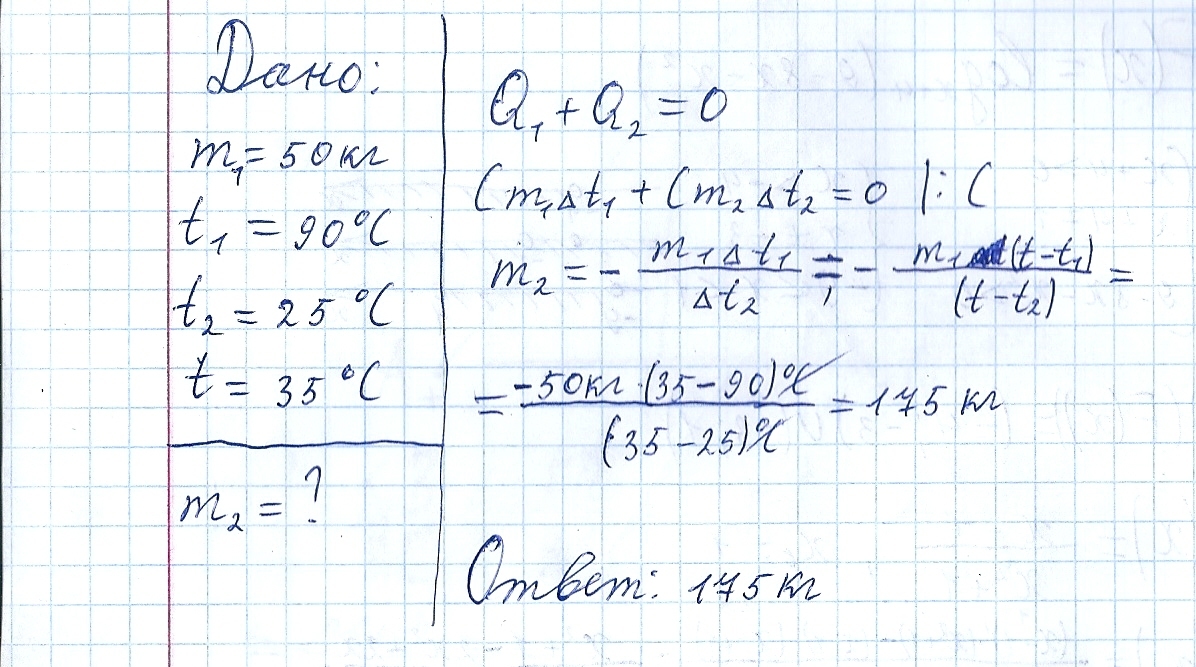 имеется 50 кг воды при температуре 90°C. Сколько нужно добавить воды при температуре 25°C, чтобы получить смесь при температуре 35°C?