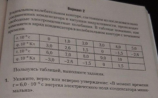 Укажите верно или неверно утверждение: "В момент времени t=6×10^-6 c энергия электрического поля конденсатора минимальна".