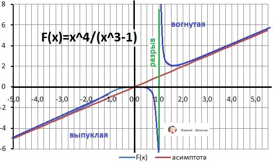 limY(-1+)(x) = + ∞ - график идёт вверх, limY(+∞)(x) = + ∞ - график идёт вверх. Вогнутая при Х∈(1;+∞)