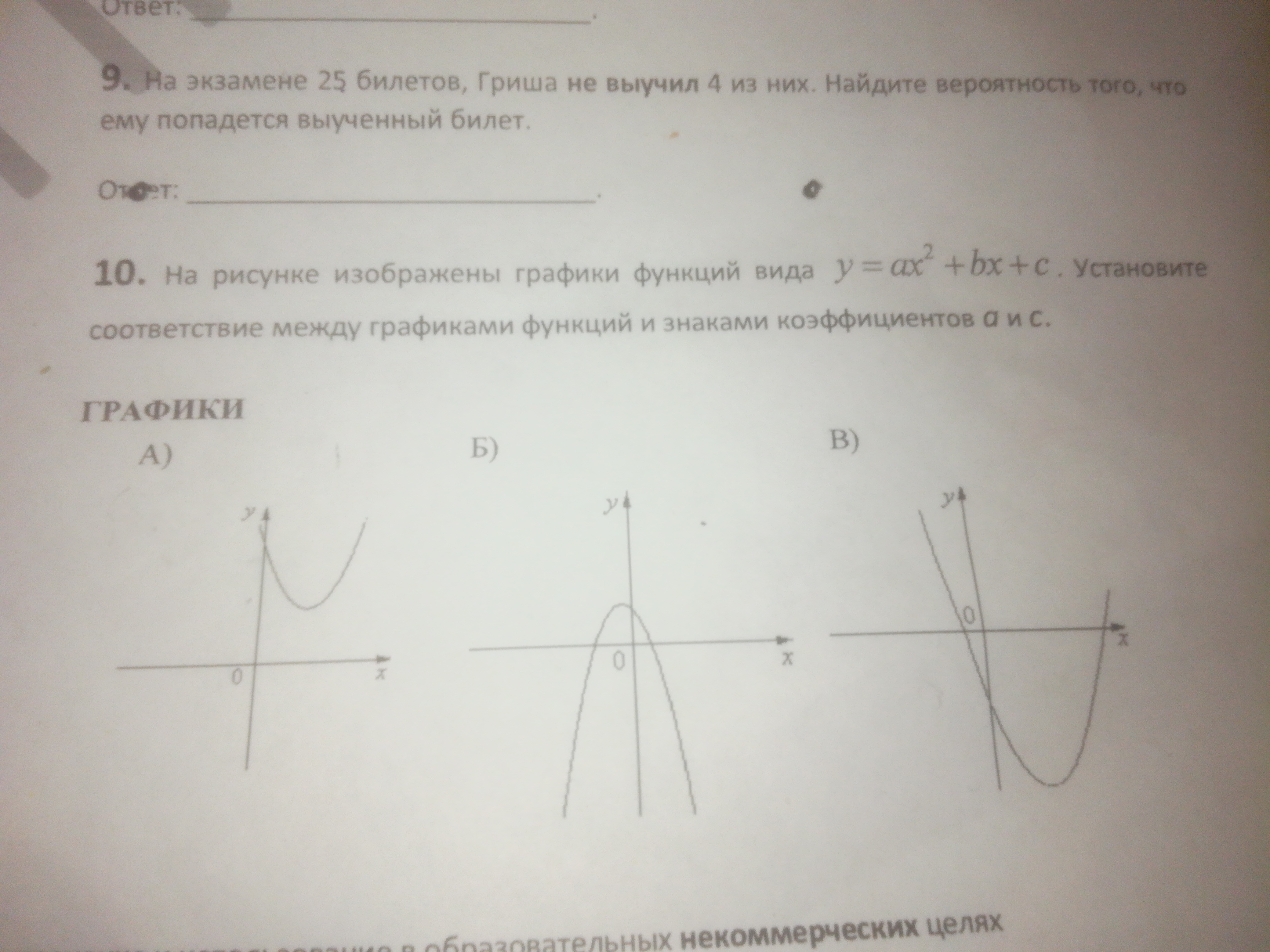 На рисунке изображены графики функций вида y=ax^2+bx^+c. Установите соответствие между графиками функций и знаками коэффициентов a и c