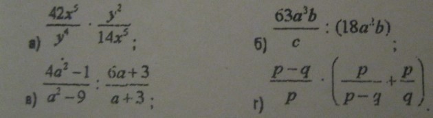 frac{42x^5}{y^4} *frac{y^2}{14x^5} =frac{3}{y^2} ; \frac{63a^3b}{c} : (18a^2b) =\frac{63a^3b}{c} * frac{1}{18a^2b} =frac{7a}{2} ; \frac{4a^2-1}{a^2-9} : frac{6a+3}{a+3} =frac{4a^2-1}{a^2-9} * frac{a+3}{6a+3} = frac{(2a-1)(2a+1)}{(a-3)(a+3)} * frac{a+3}{3(2a+1)}=frac{2a-1}{3(a-3)} ;\frac{p-q}{p} *( frac{p}{p-q} +frac{p}{q} )=frac{(p-q)p}{p(p-q)} +frac{(p-q)p}{pq} =1+frac{p-q}{q} =frac{q+p-q}{q} =frac{p}{q} ;